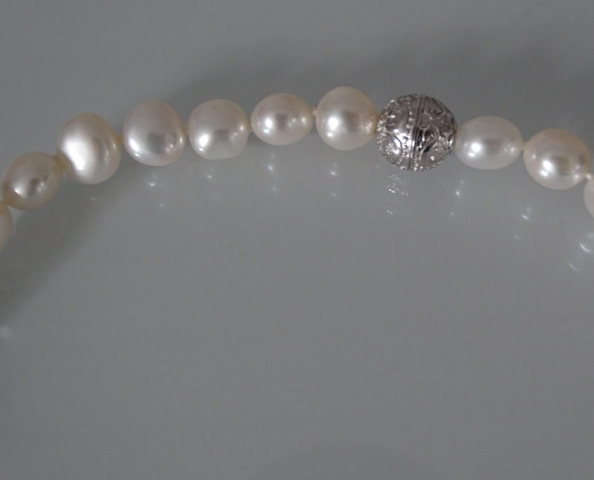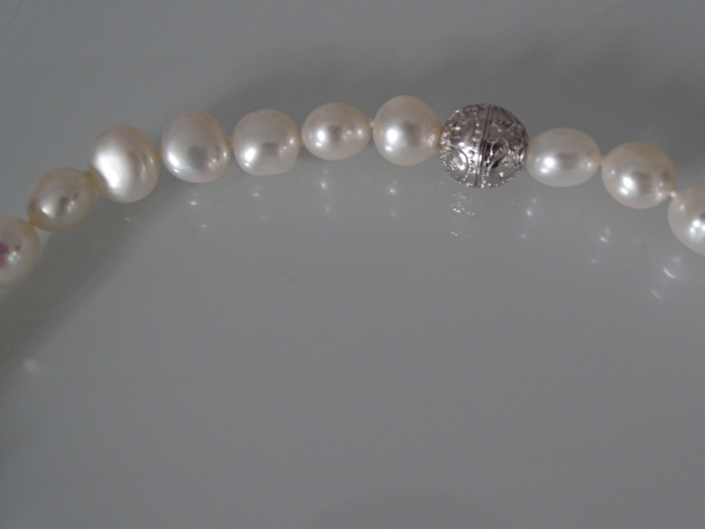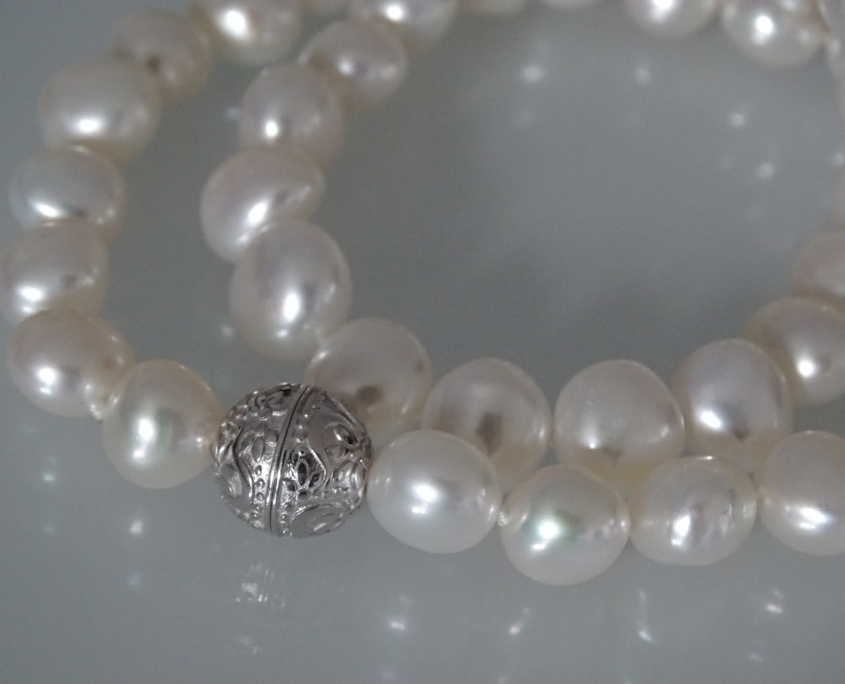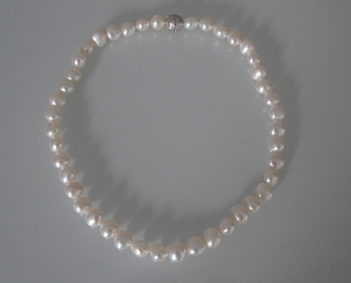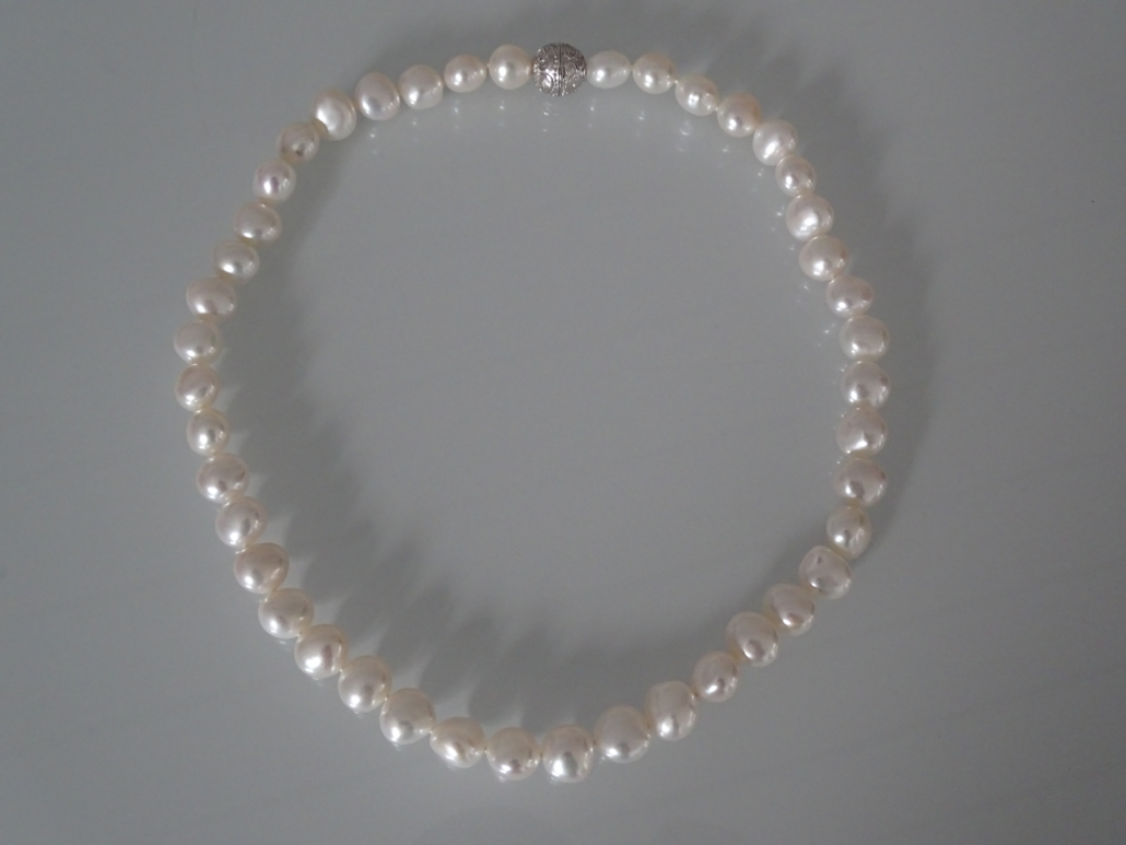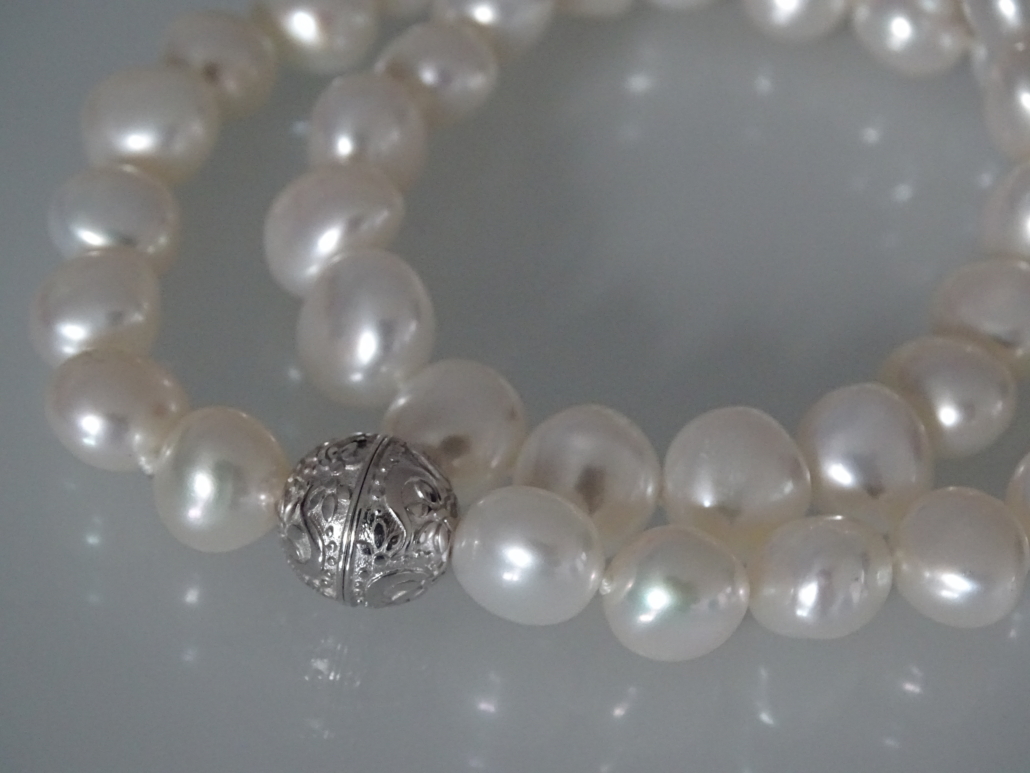 Collier mit weissen Barockperlen 10 – 11 mm, wunderschöner Lüster. Magnetverschluss Silber rhodiniert.