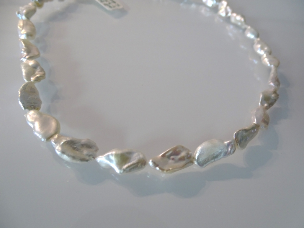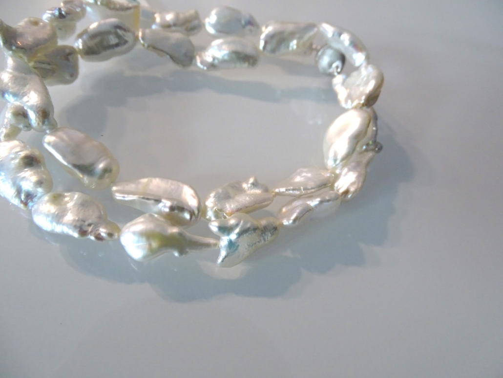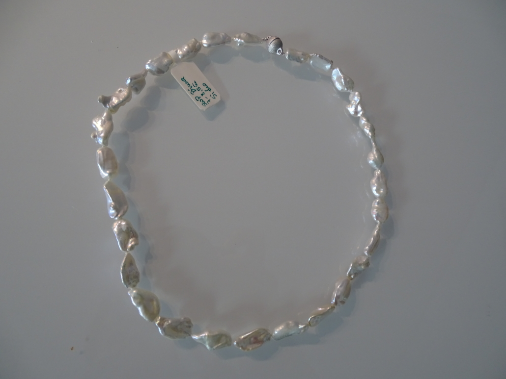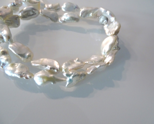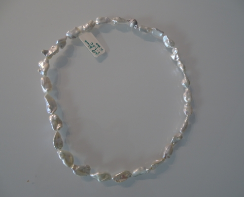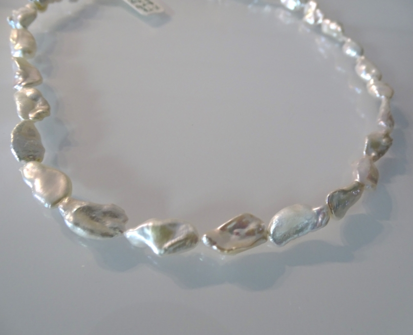 Apart und schlicht – Collier aus Biwa-Süsswasserperlen 7 – 8,5 mm, in strahlendem Weiss. Magnetverschluss Silber rhodiniert.