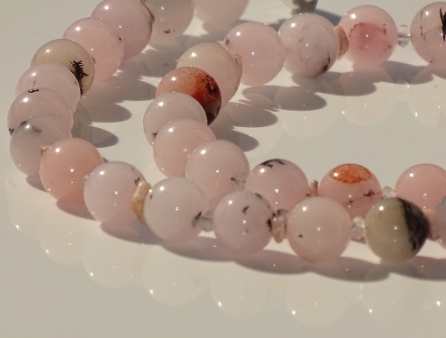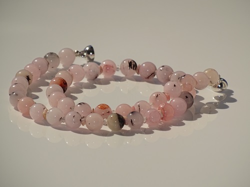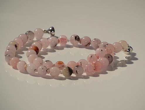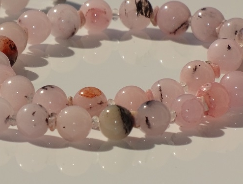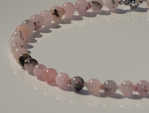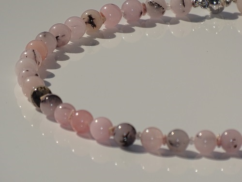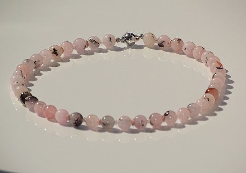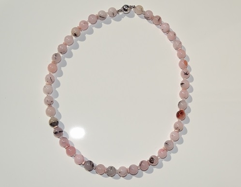 Wunderschönes Collier mit dem seltenen Cherry-Blossom-Stein. Kombiniert mit feinem Rhodochrosit und Rosenquarz. Magnetverschluss Silber rhodiniert. Sehr apart. Passt auch gut zu dunklen Farben.