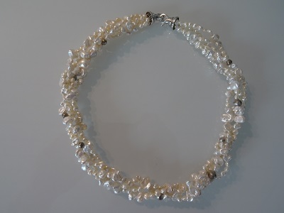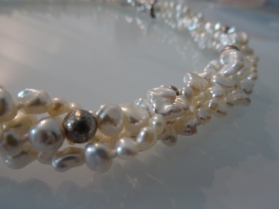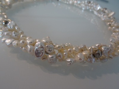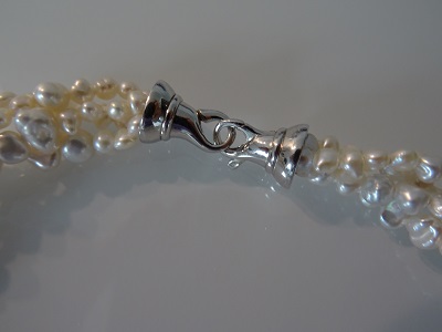 Keshi Süsswasserperlen weiss, in wunderschönem Lüster. Zwischenteile und griffiger Karabiner-Verschluss in Silber rhodiniert. Kann beim Tragen mehr oder weniger gedreht werden. Ein selten schönes Schmuckstück!