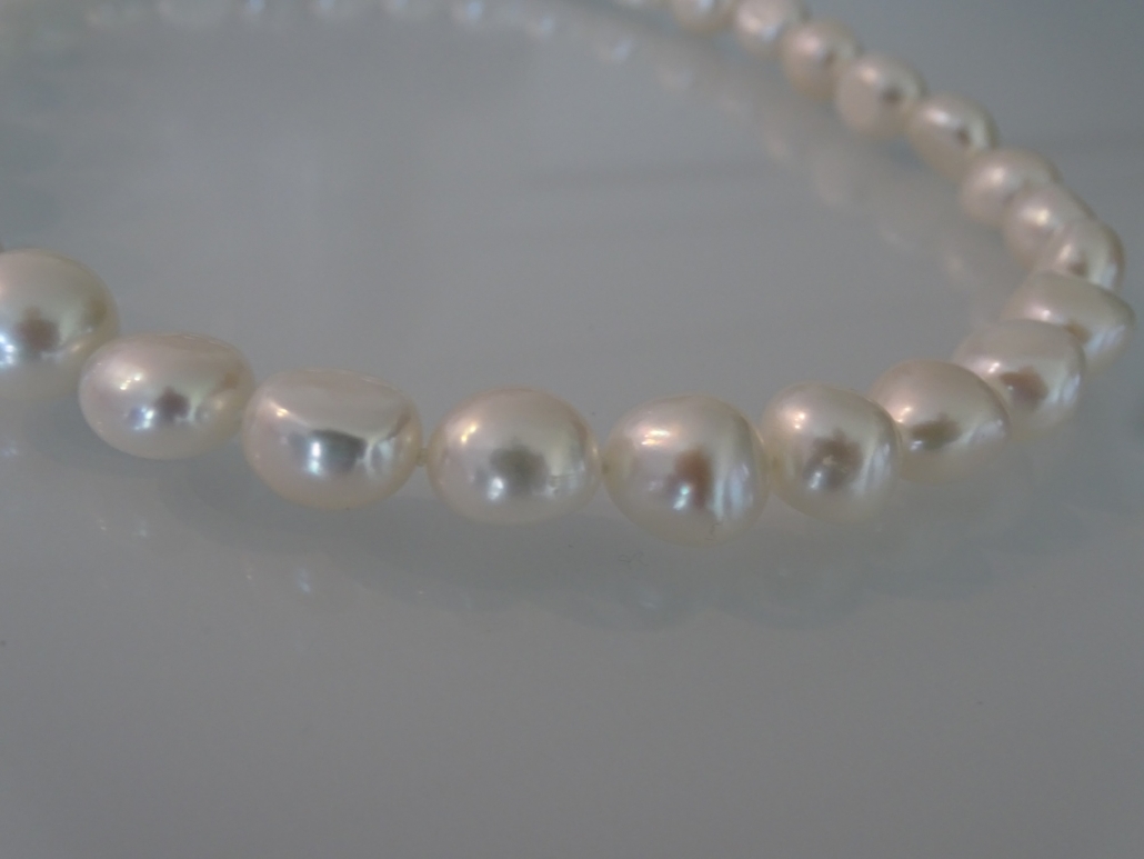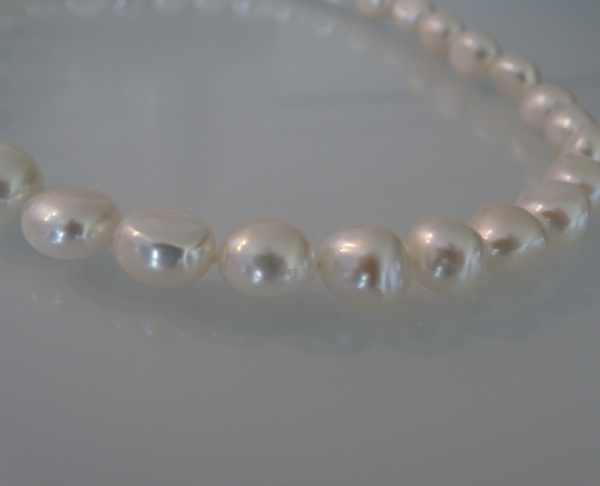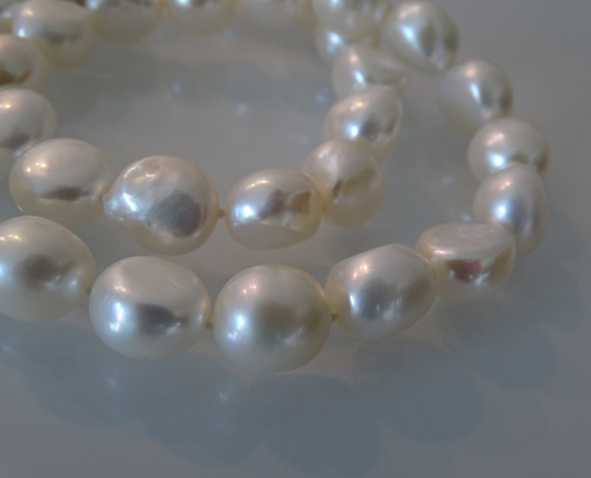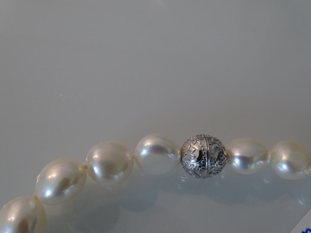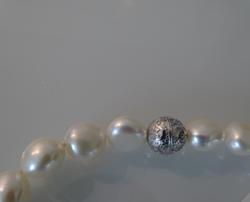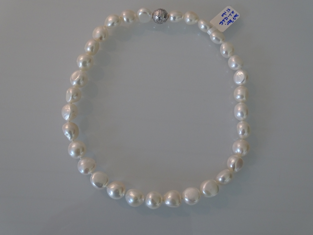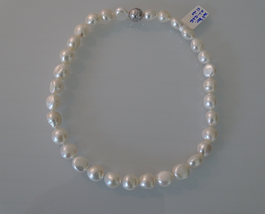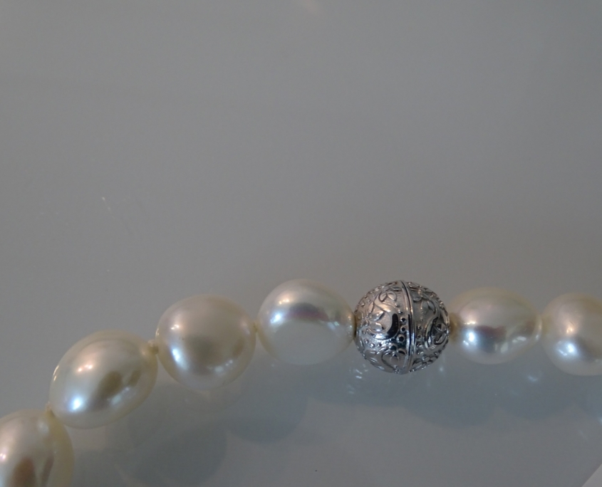 Tolle Barockperlen 11,6 – 12,5 mm mit wunderschönem Lüster. Magnetverschluss in Silber rhodiniert mit Ornamenten.
