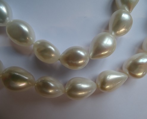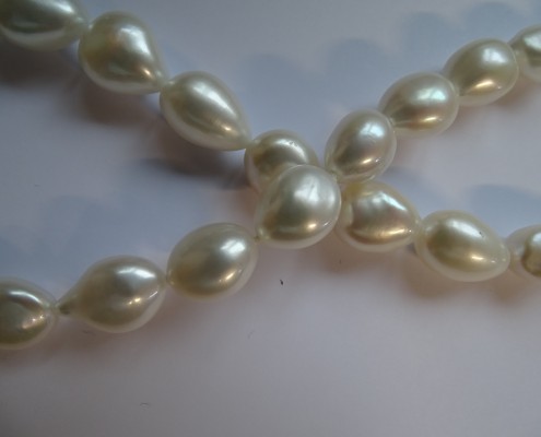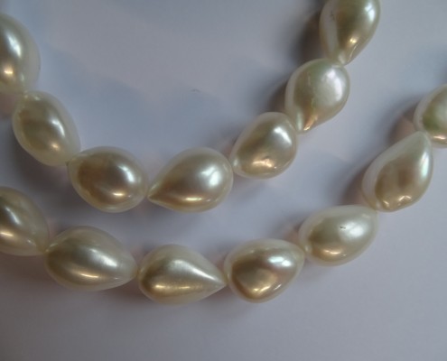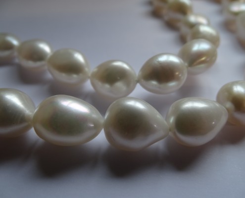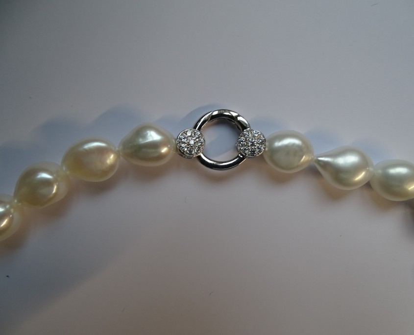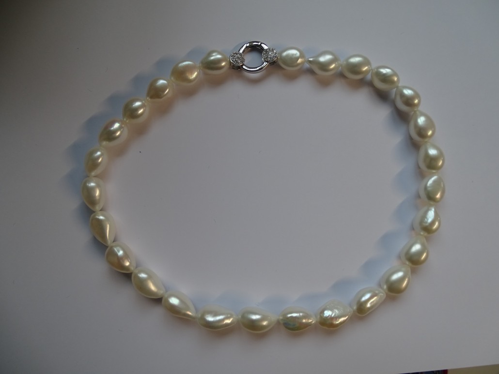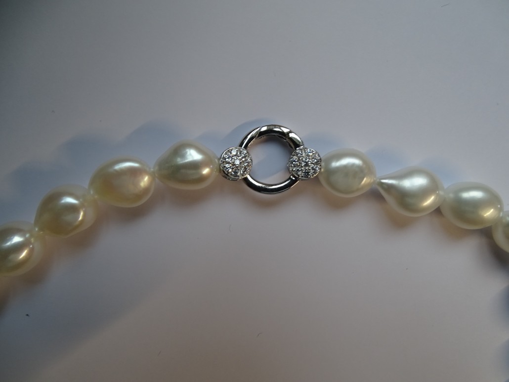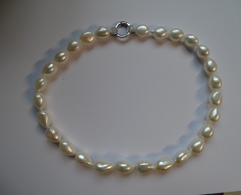 Collier in barock-förmigen Süsswasserperlen in 12 – 13 mm Grösse. Schlicht aber doch speziell durch die Perlenform. Toller Lüster. Verschluss: Federring mit zwei zirkonienbesetzten Anschlussteilen in Silber rhodiniert glanz. Sehr schön, auch vorne seitlich zu tragen.