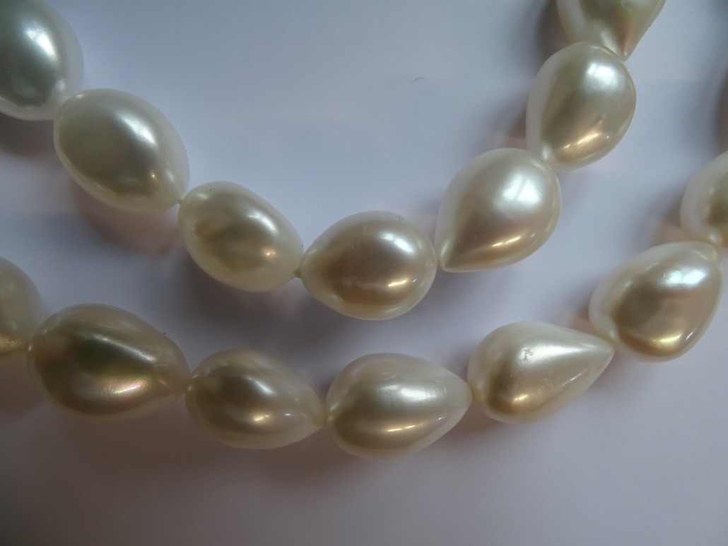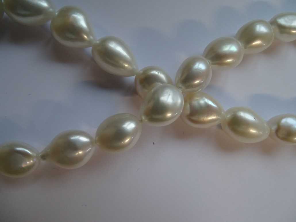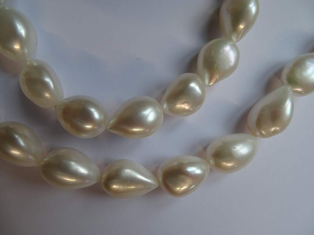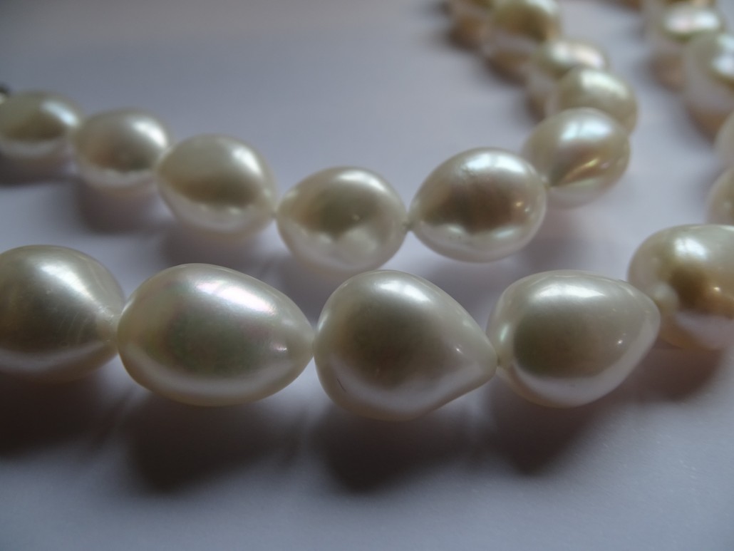 Collier in barock-förmigen Süsswasserperlen in 12 – 13 mm Grösse. Schlicht aber doch speziell durch die Perlenform. Toller Lüster. Verschluss: Federring mit zwei zirkonienbesetzten Anschlussteilen in Silber rhodiniert glanz. Sehr schön, auch vorne seitlich zu tragen.
