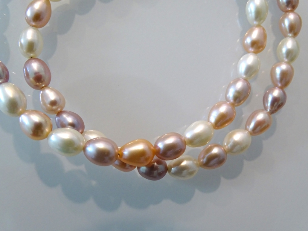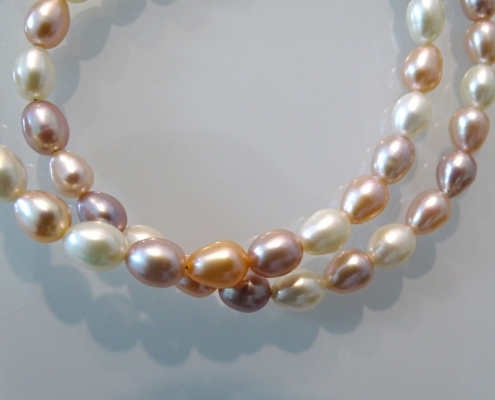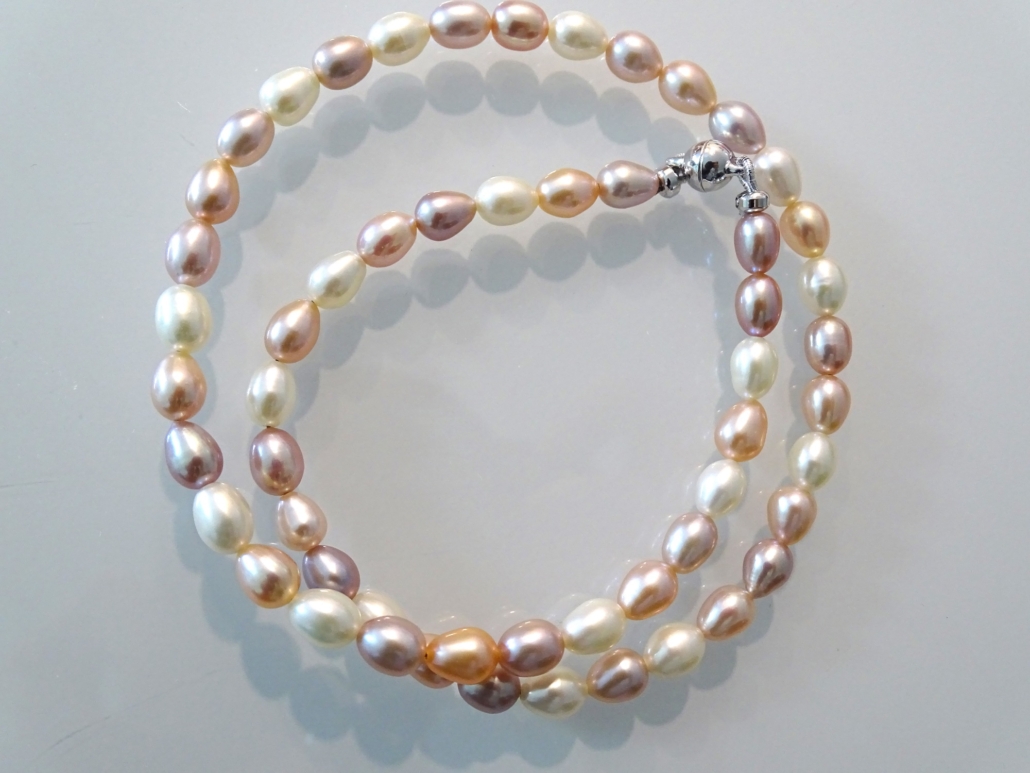 Reisförmige Perlen von weiss/rosé/lachs 5,5 – 6 mm. Bequemer Magnetverschluss in Silber rhodiniert.