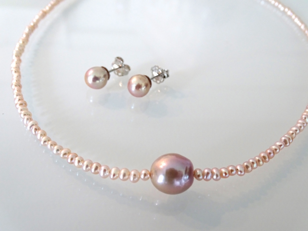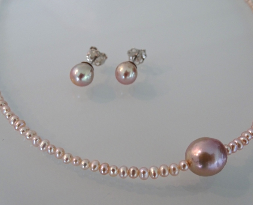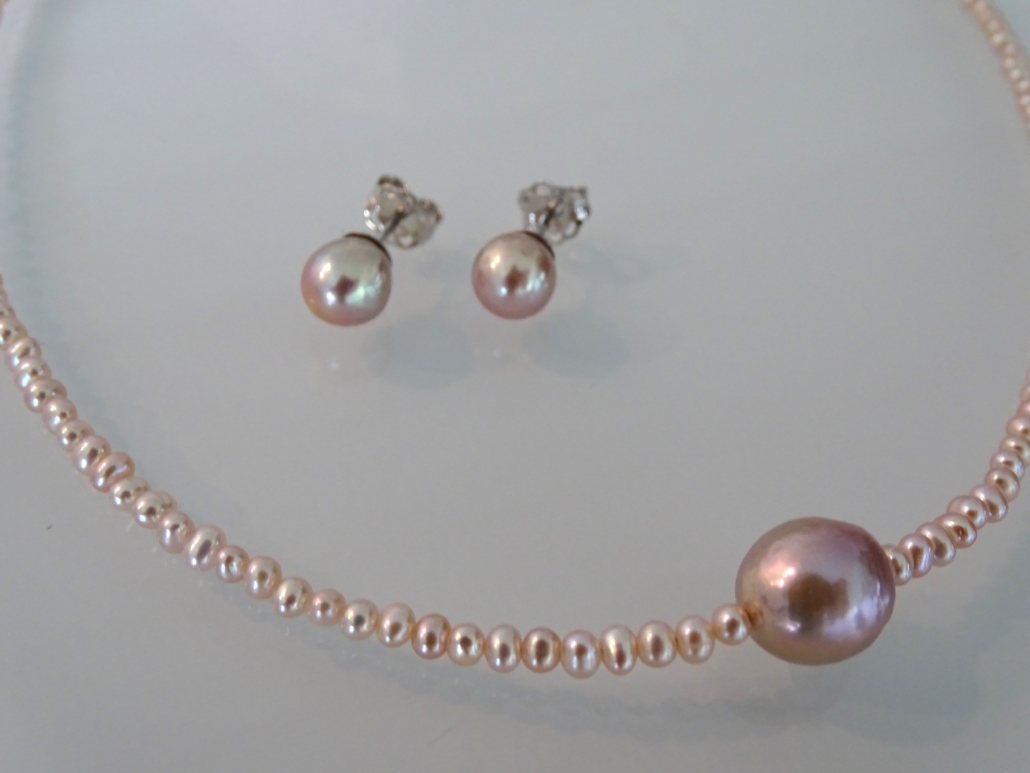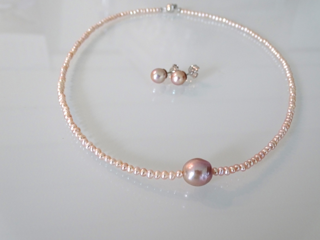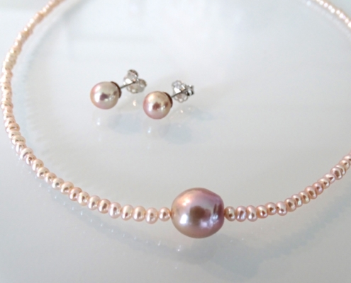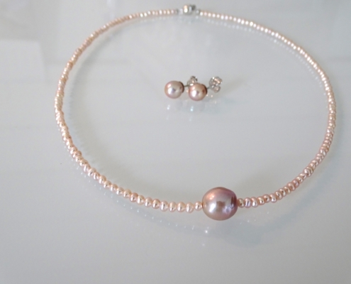 Süsswasserperlen natur rosé 2,5 – 3 mm. Mittelperle Ming 10 – 13 mm. Magnetverschluss Silber rhodiniert. Dazu passender Ohrschmuck mit Ming-Perlen, Silber rhodiniert.