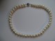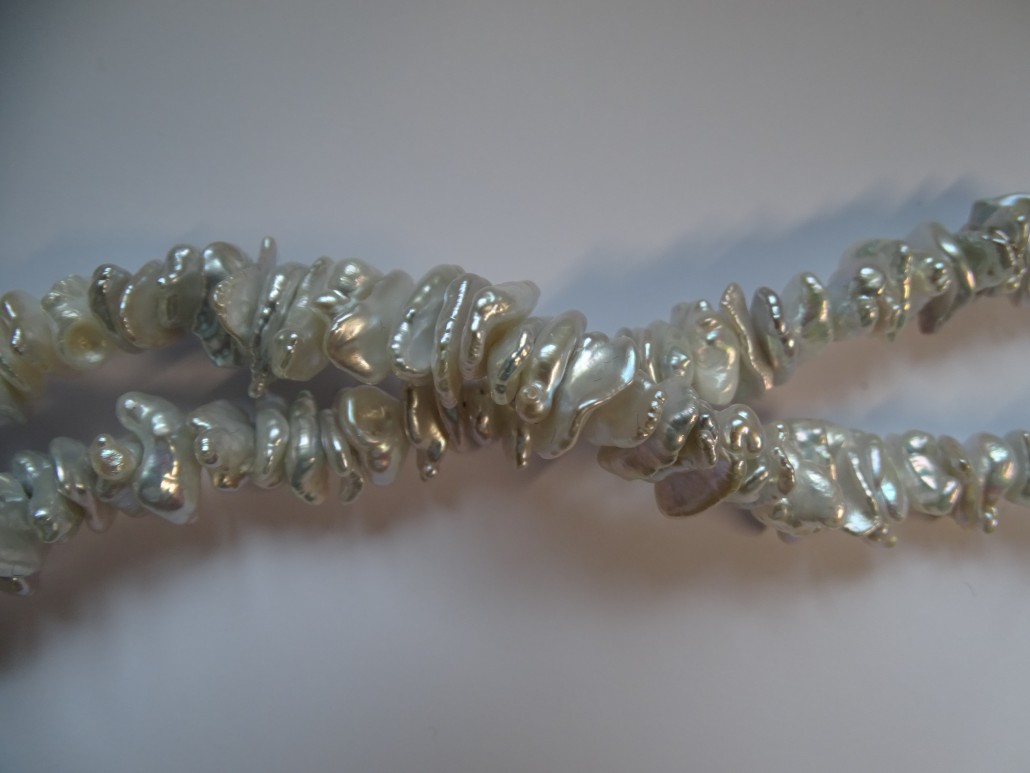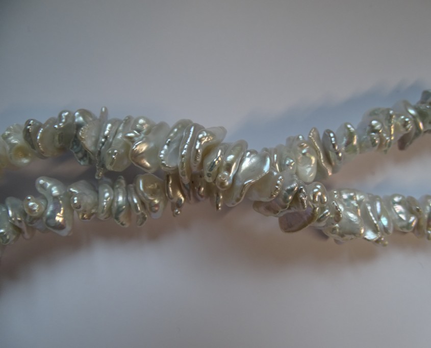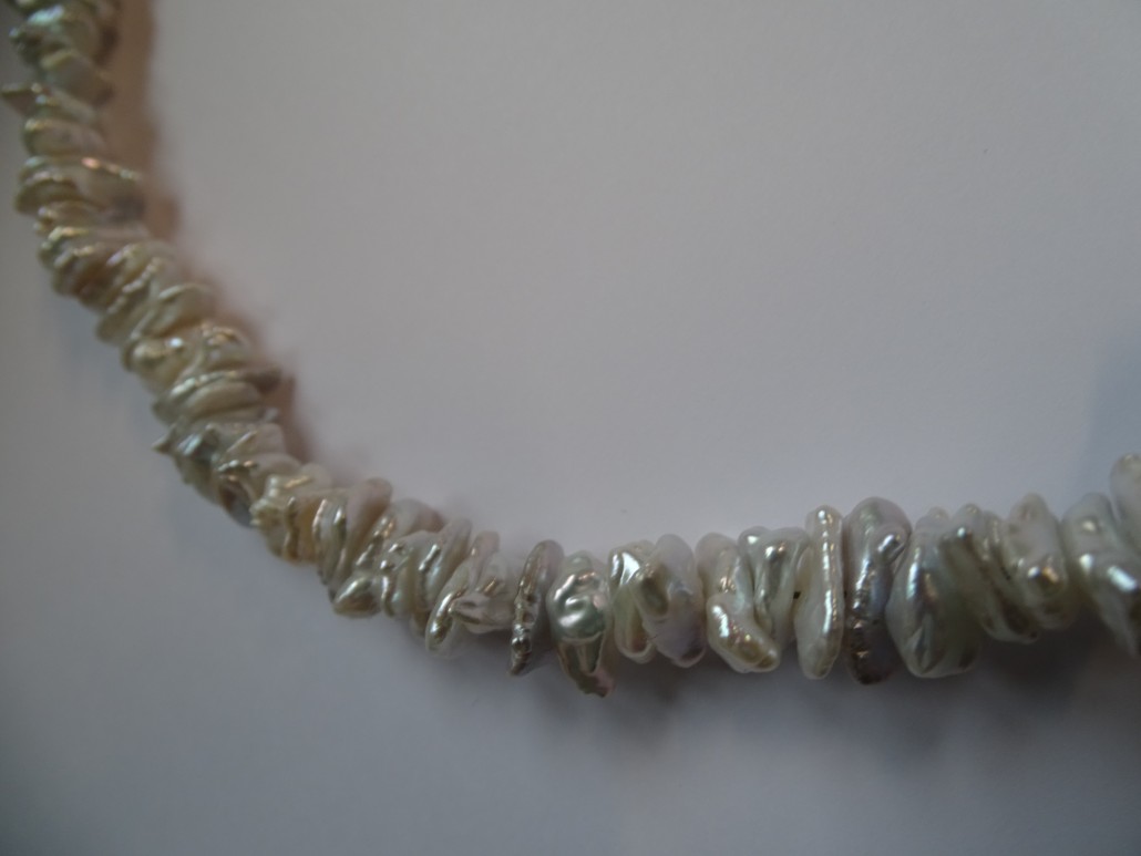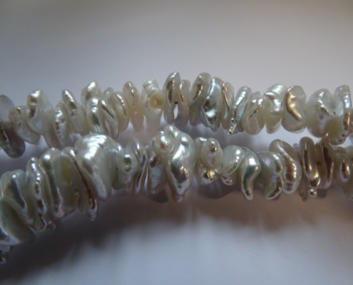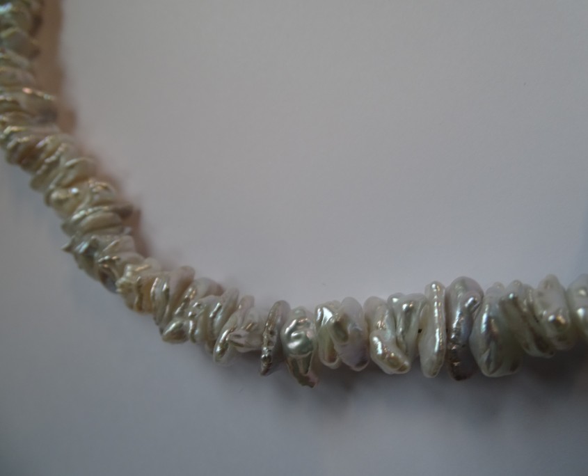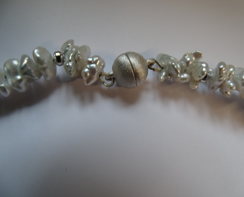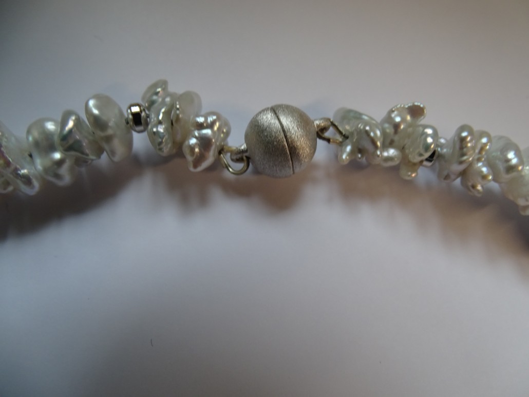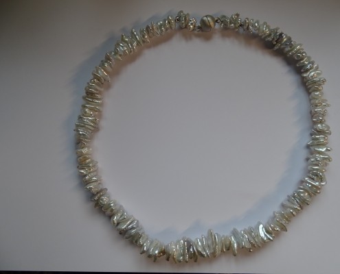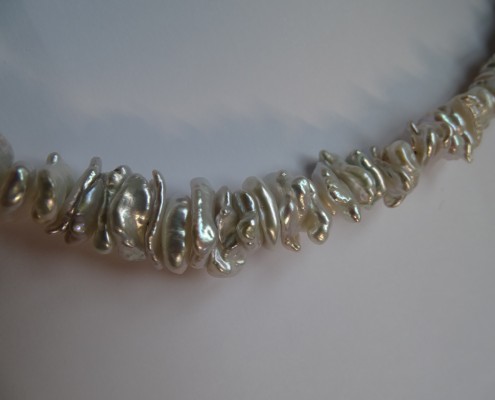 Süsswasserperlen-Collier mit Keshi Perlen 8 – 9 mm. Die Perlen sind mittig gebohrt. Der Lüster ist einmalig. Die extra-vagante Perlenform wirkt trotzdem ruhig. Verschluss: Magnet in Silber rhodiniert matt.