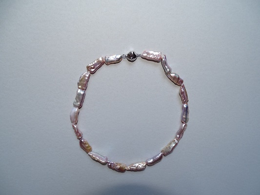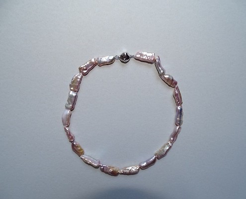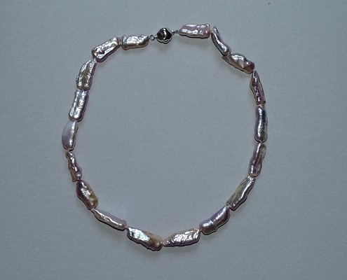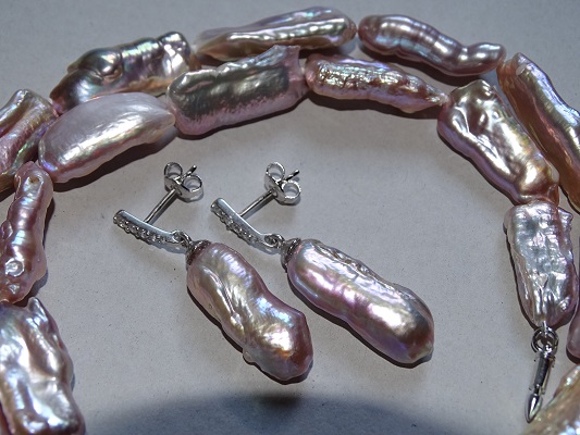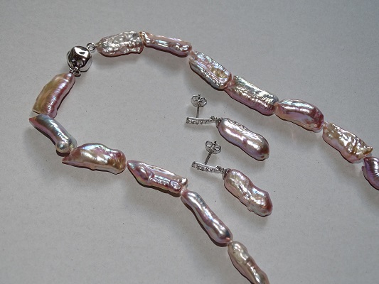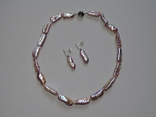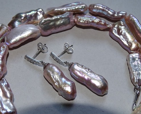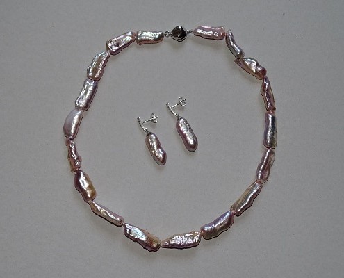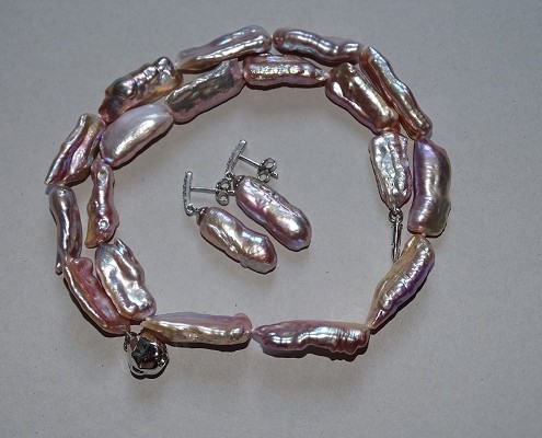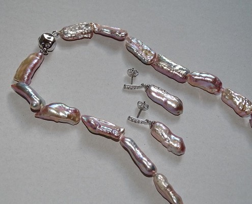 Dieses wunderschöne Collier mit den passenden Ohrsteckern ist aus Keshi-Perlen 9 – 10,5 x 20 mm hergestellt. Die besonderen Perlen sind Kaki-farbig mit einem unvergleichlichen, natürlichen Glanz. Bequemer Klick-Nugget-Verschluss glanz, in Silber rhodiniert.
