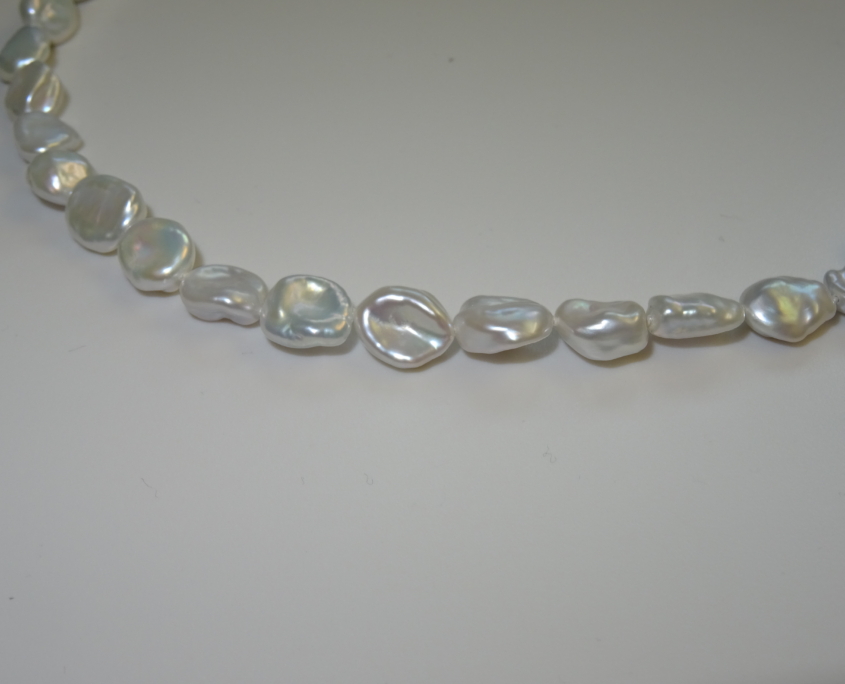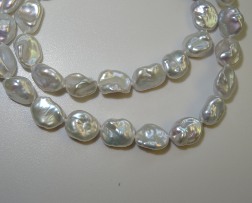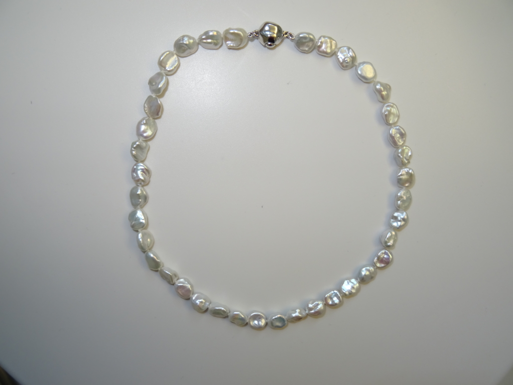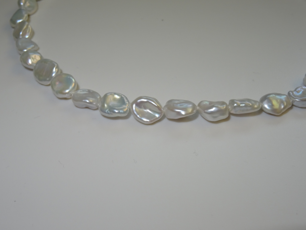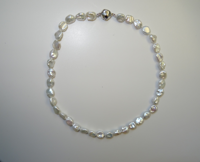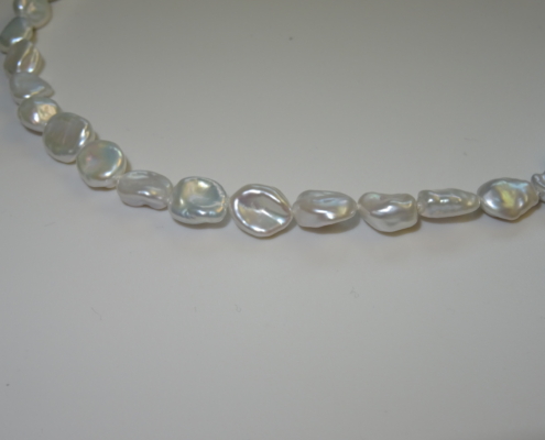 Keshi Süsswasserperlen mit ihrer ganz besonderen Eleganz und wunderschönem Lüster. Die speziellen Formen dieser Perlen machen ein Schmuckstück besonders interessant. Perlengrösse 8 – 9 mm, weiss. Verschluss: Nugget Click in Silber rhodiniert.