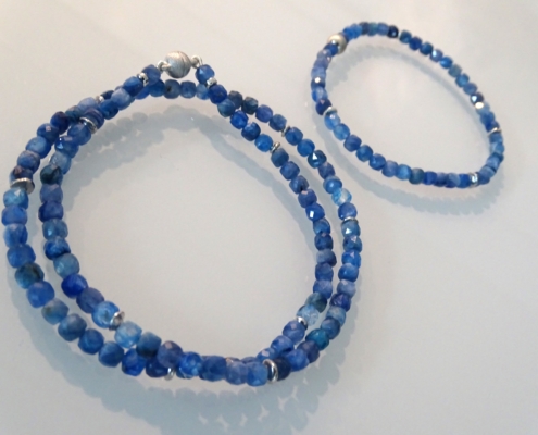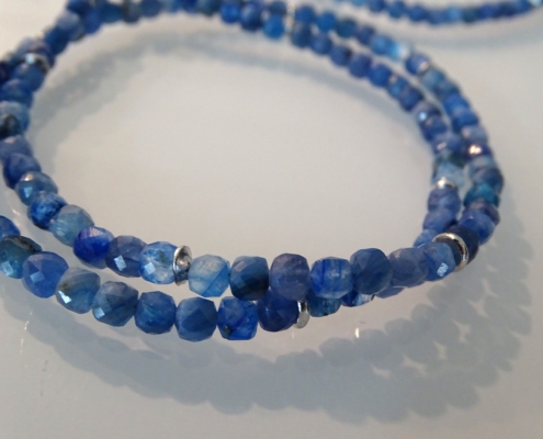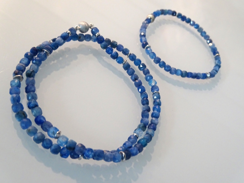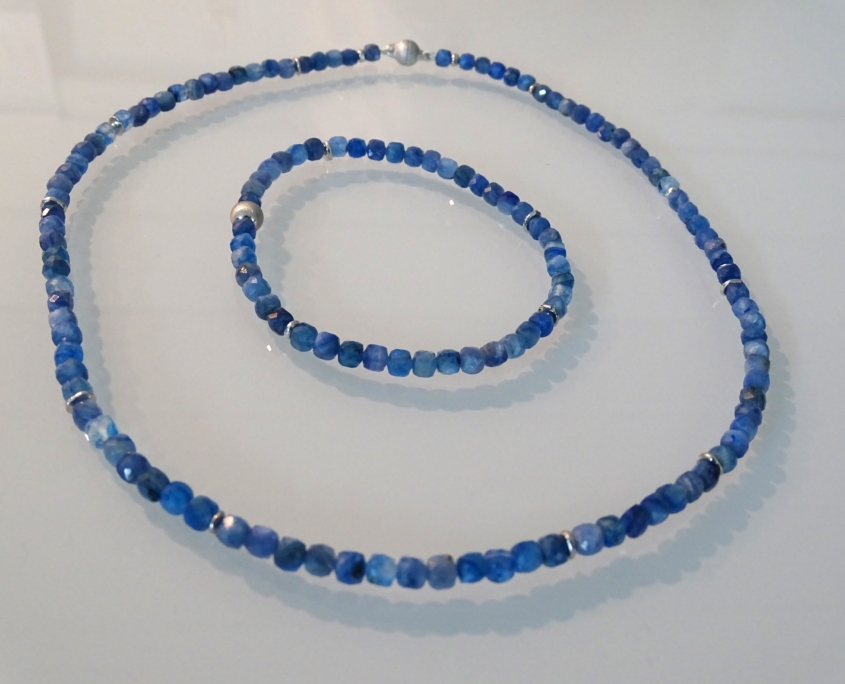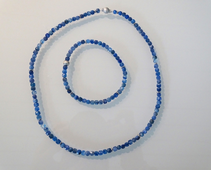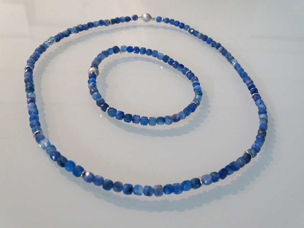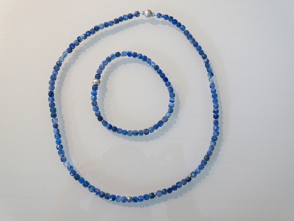 Collier und Armband in Kyanit cube 4 x 4 mm, mit Silberzwischenteilen rhodiniert. Magnetverschluss ebenfalls rhodiniert. Set: Collier und Armband.