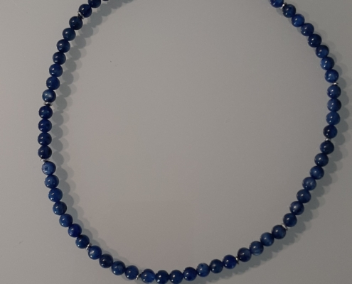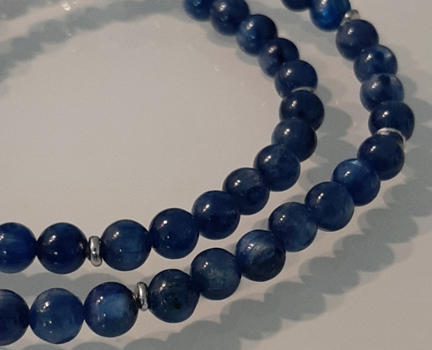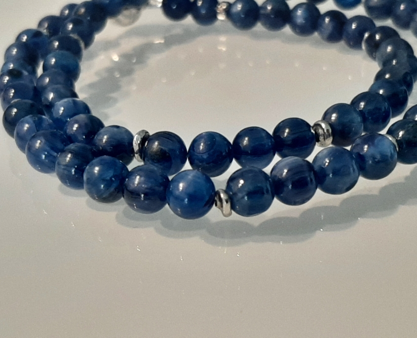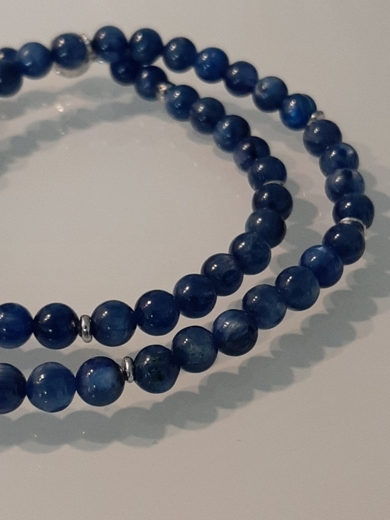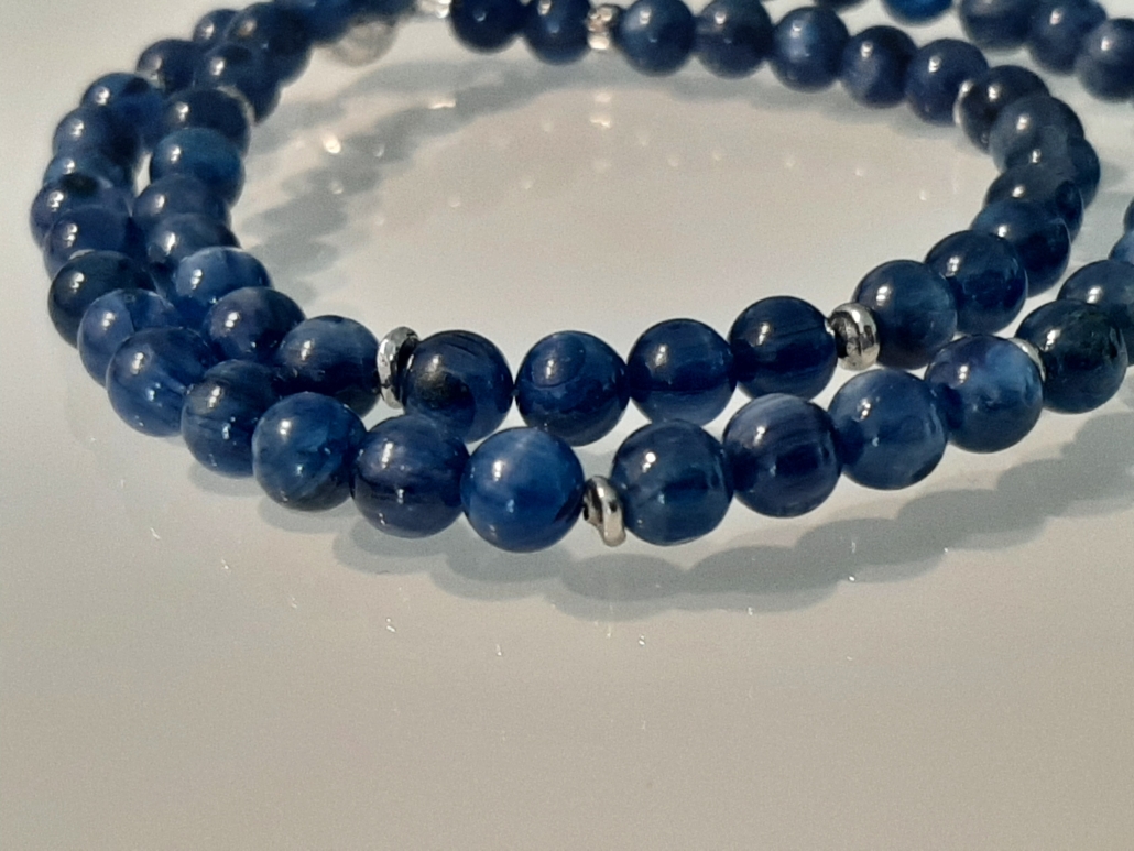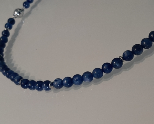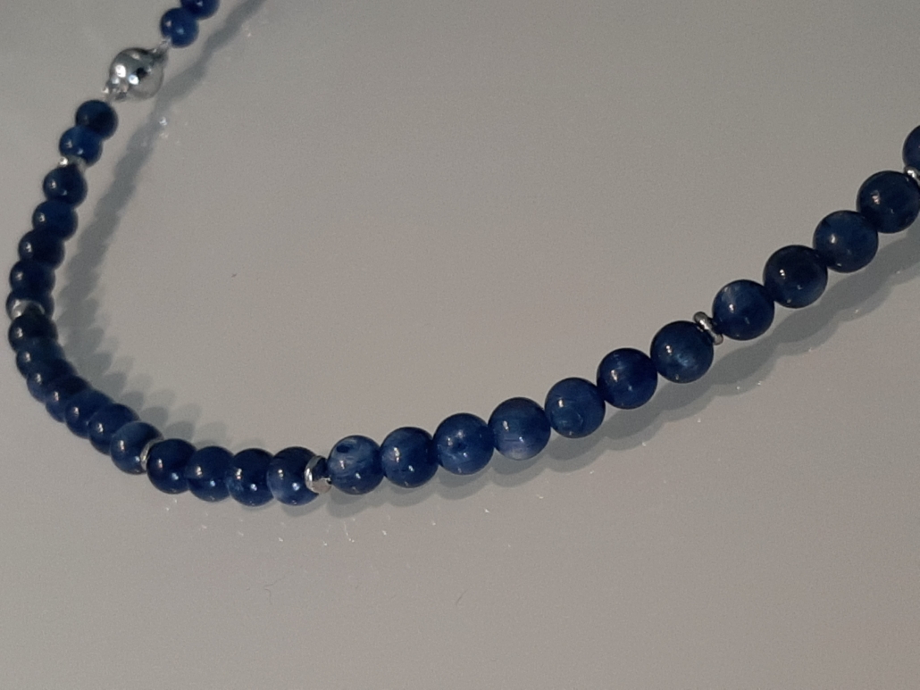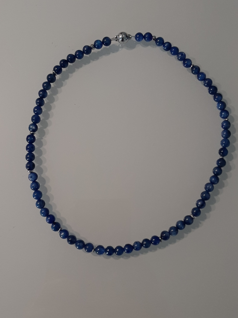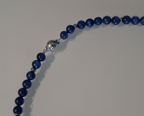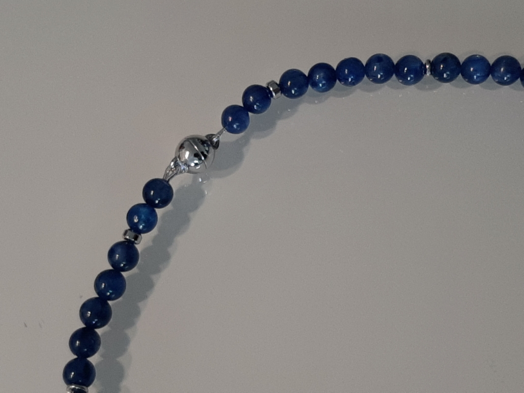 Der strahlend schöne, dezente Kyanit passt sehr gut zu allen Blautönen, weiss, grün türkis, usw. Das bequeme Collier zieht man mit dem Magnetverschluss sehr gerne an.