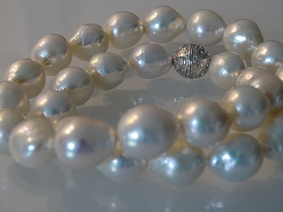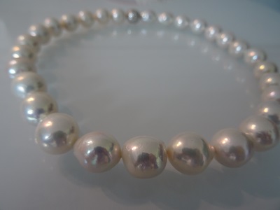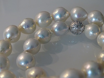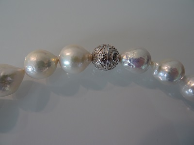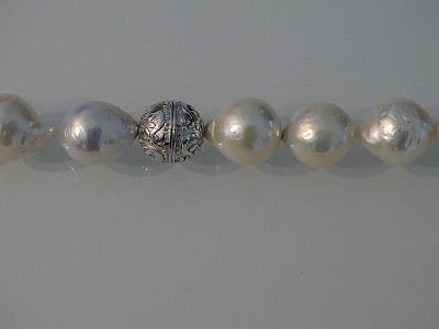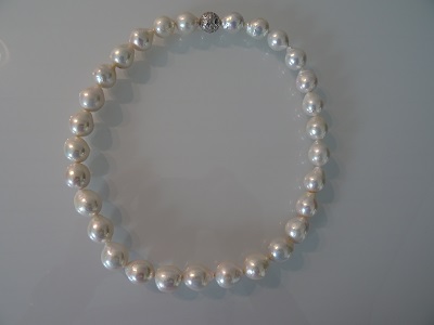 Einzigartiges Collier aus weissen Ming Perlen (10 – 12 mm), zauberhafter Lüster. Magnetverschluss in Silber rhodiniert.