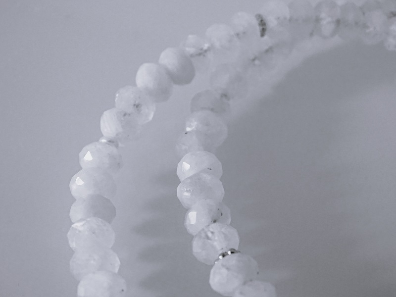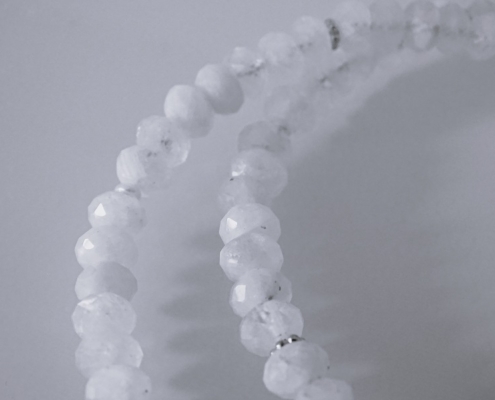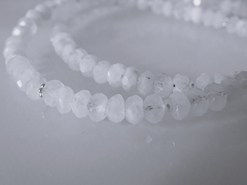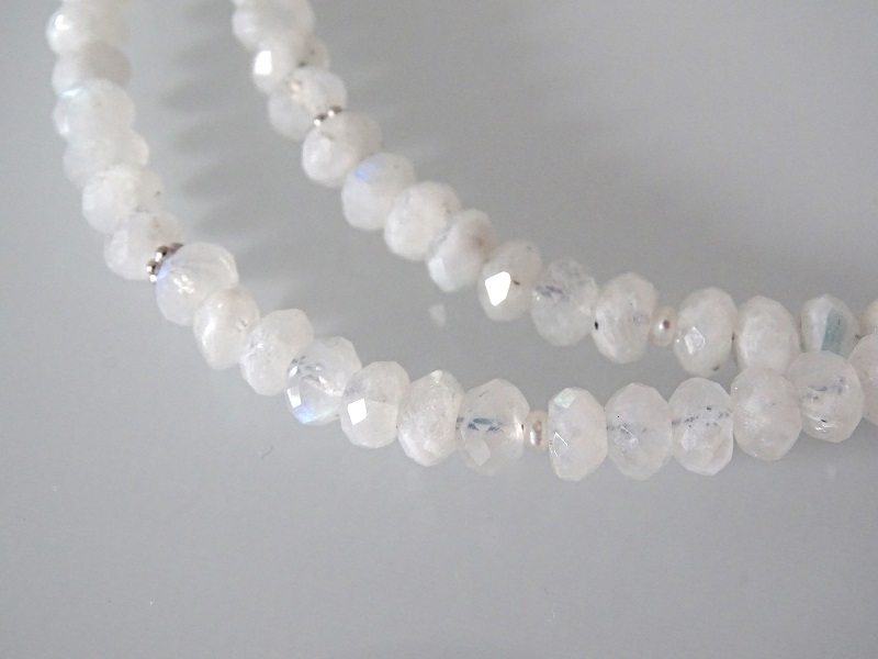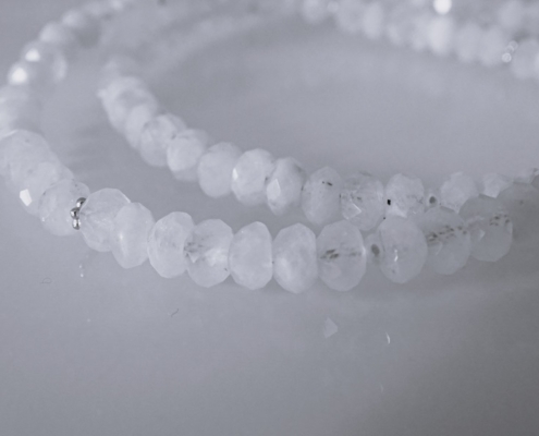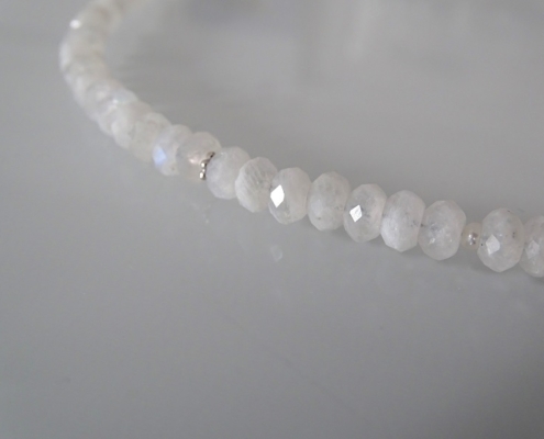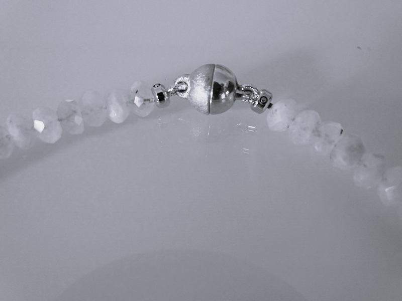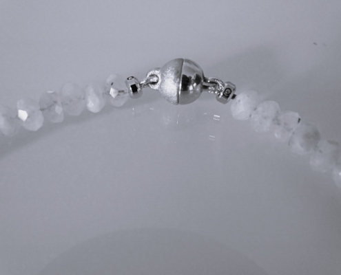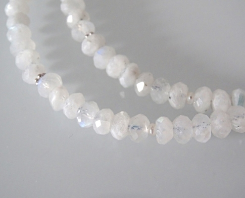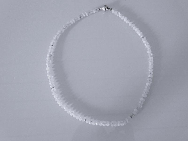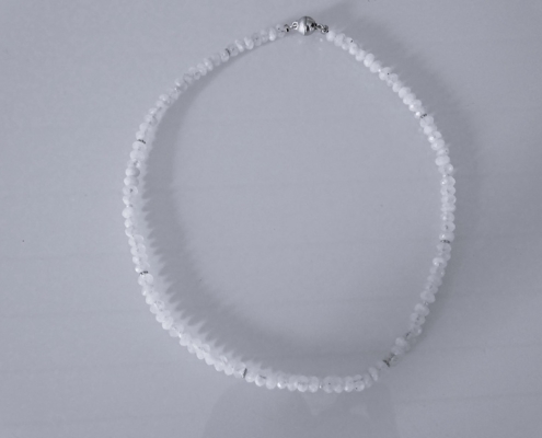 Collier aus Mondstein in Facettenschliff. Kombiniert mit winzigen Süsswasserperlchen und Silber-Zwischenteilen. Verschluss: Magnet 8 mm in Silber rhodiniert.