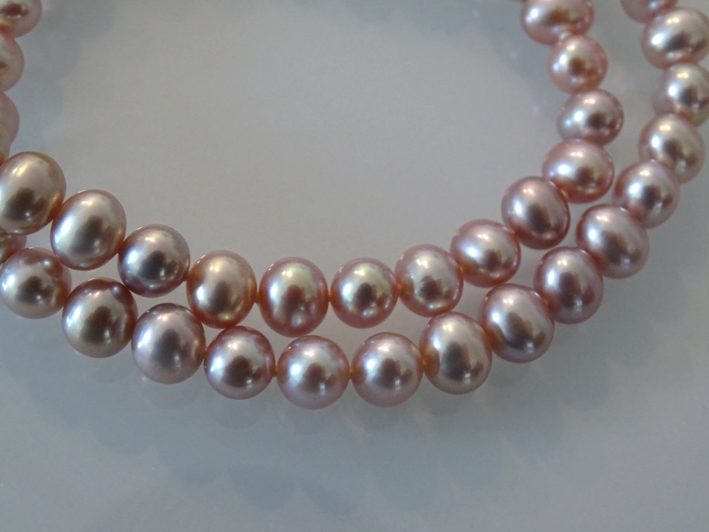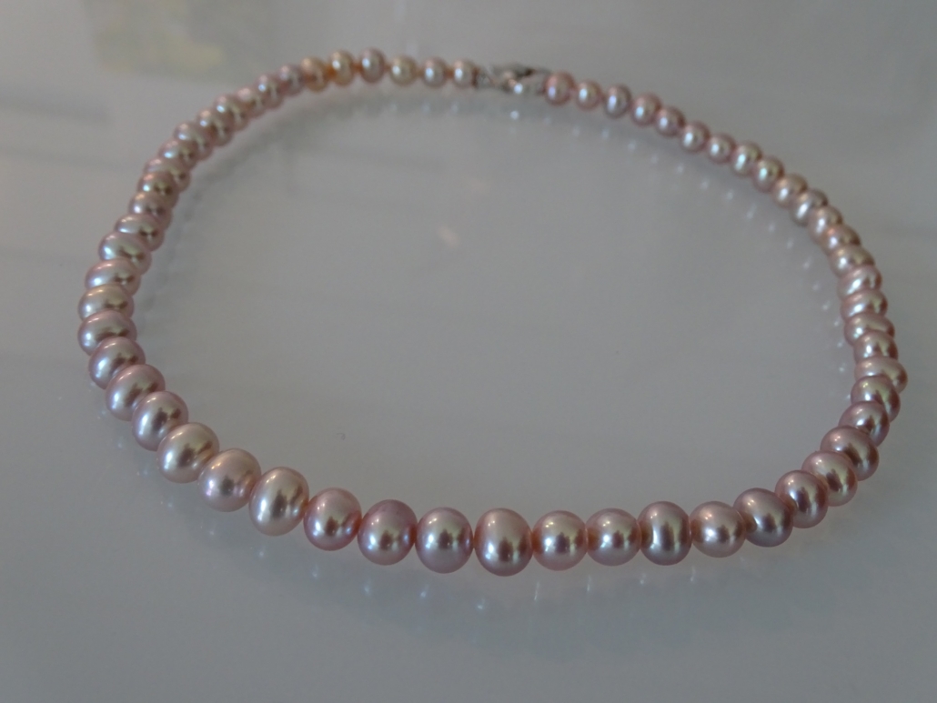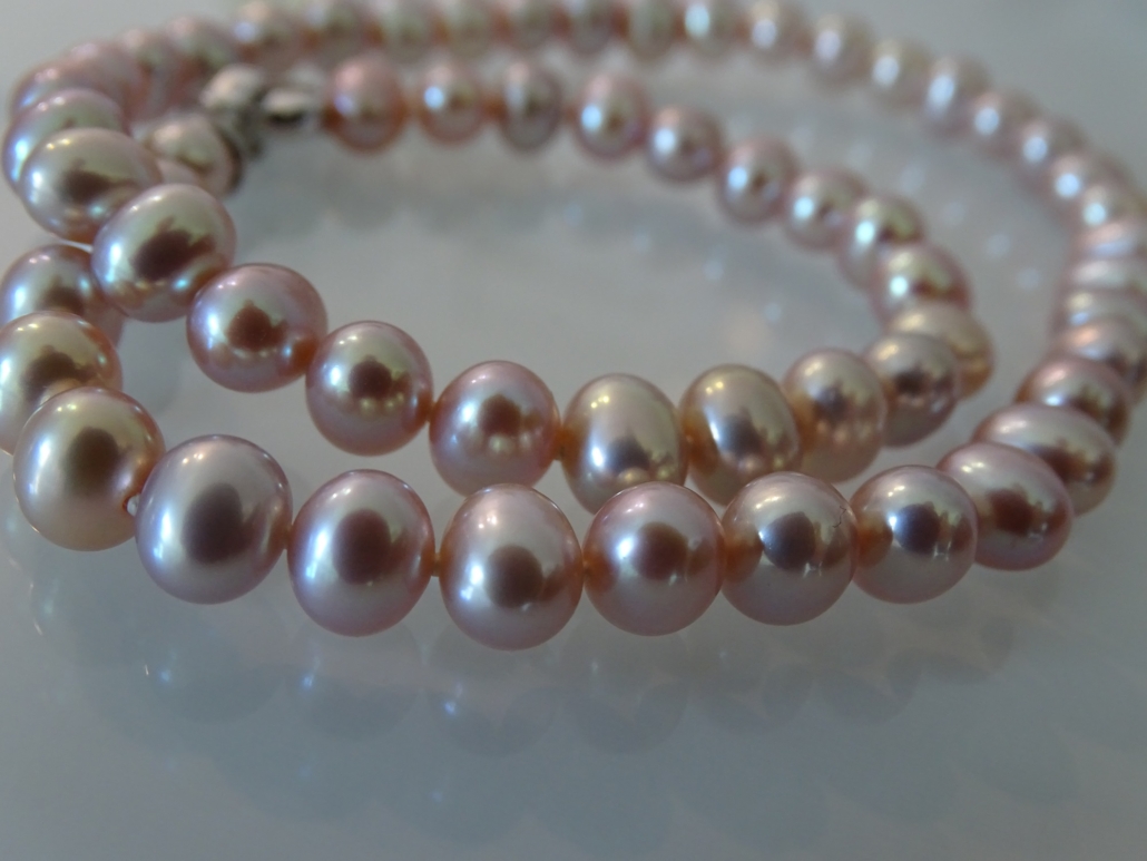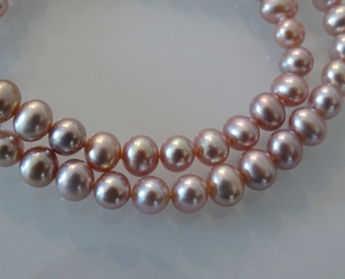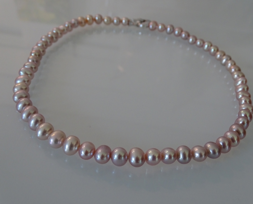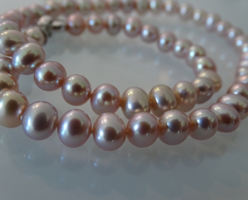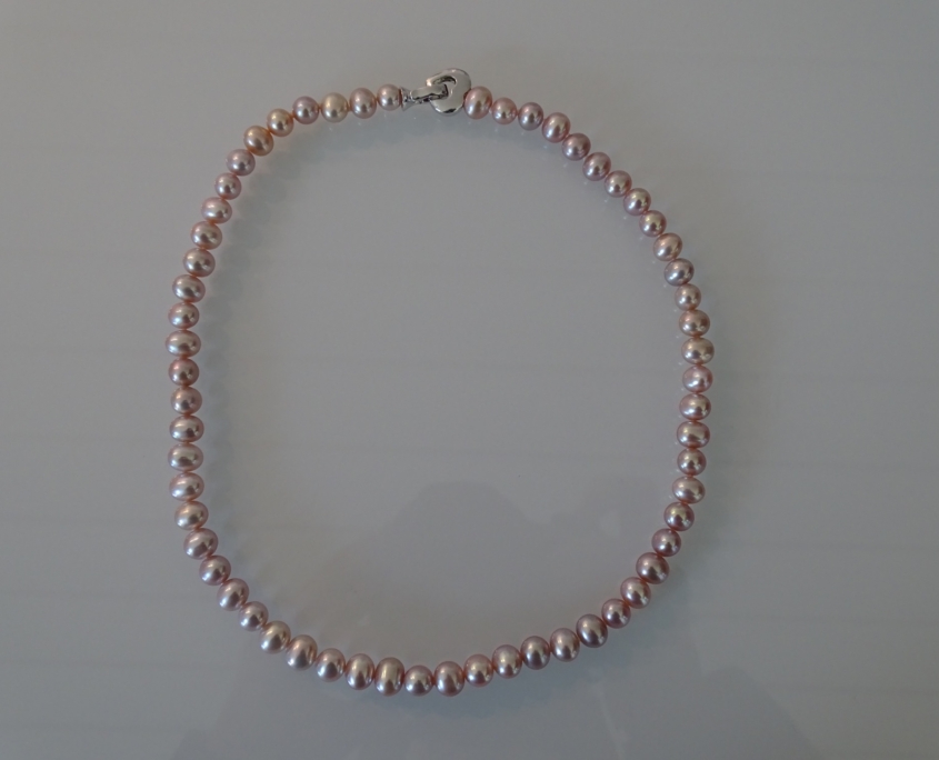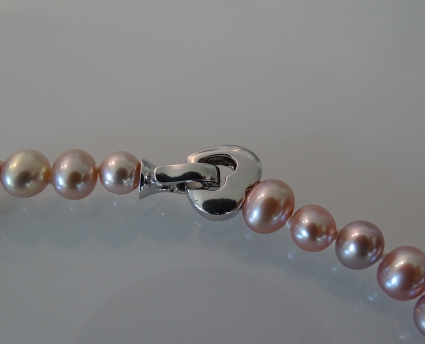 Naturfarbene, rosé Potatoperlen 6,5 – 7 mm mit wunderschönem Lüster. Eine Begleiterin zu vielen Gelegenheiten. Herzverschluss in Silber rhodiniert.